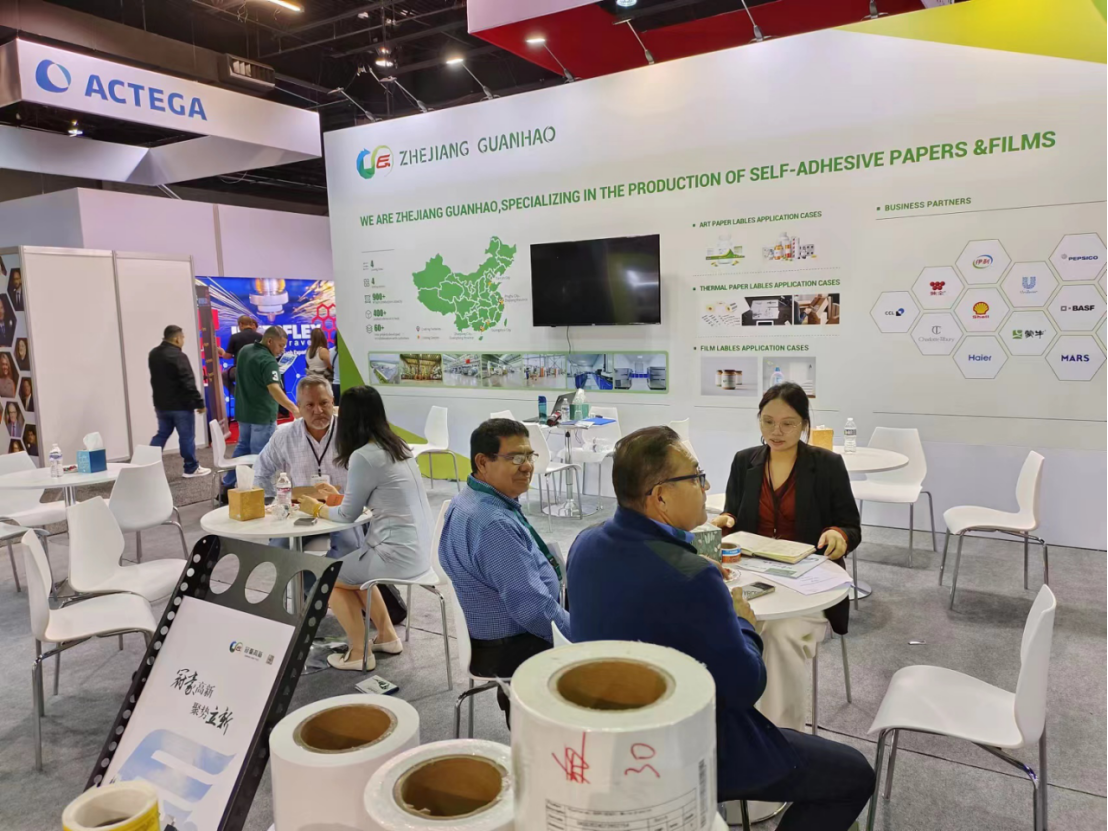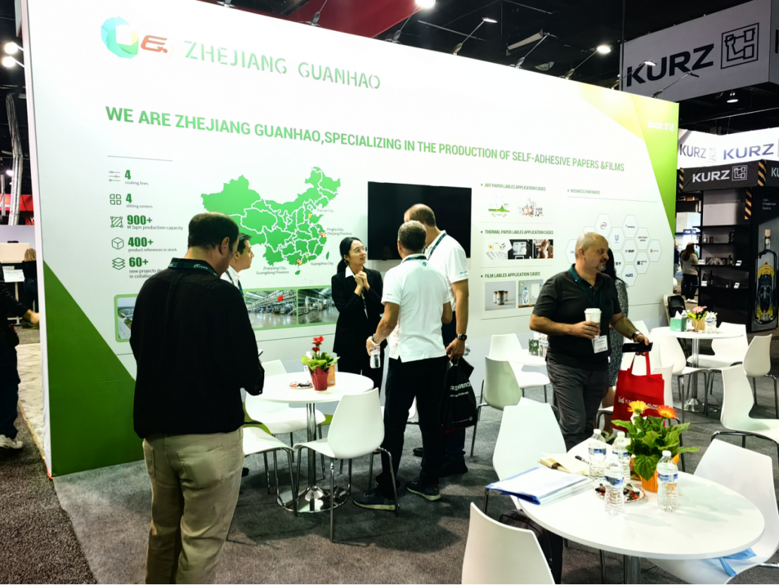 浙江冠豪作為不干膠標簽材料專業制造商亮相此次展會,全方位展現了在醫藥、飲料、食品、日化、文教等領域應用的38款明星產品,如透明BOPP、鍍鋁BOPP、PE、可移除等產品,雖展會上材料商眾多,但我司環保型產品因性能優異,可以減少在整個價值鏈中產生的廢棄物和碳足跡,直擊客戶心理,展位前人流絡繹不絕,吸引了來自全球各地客戶駐足了解及交流討論。